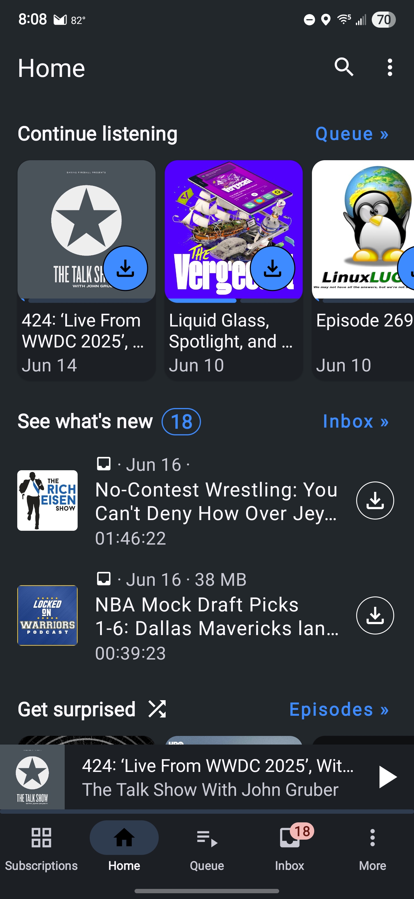 The Home Tab is their try at curation. It takes your subscriptions and puts them in sections like “What’s New?” and “Continue Listening.” There’s also a section that will let you shuffle between pods that you subscribe to. I like the Home Tab, but I don’t use it. I usually know pretty well what I want to listen to when I pop into my podcast app.